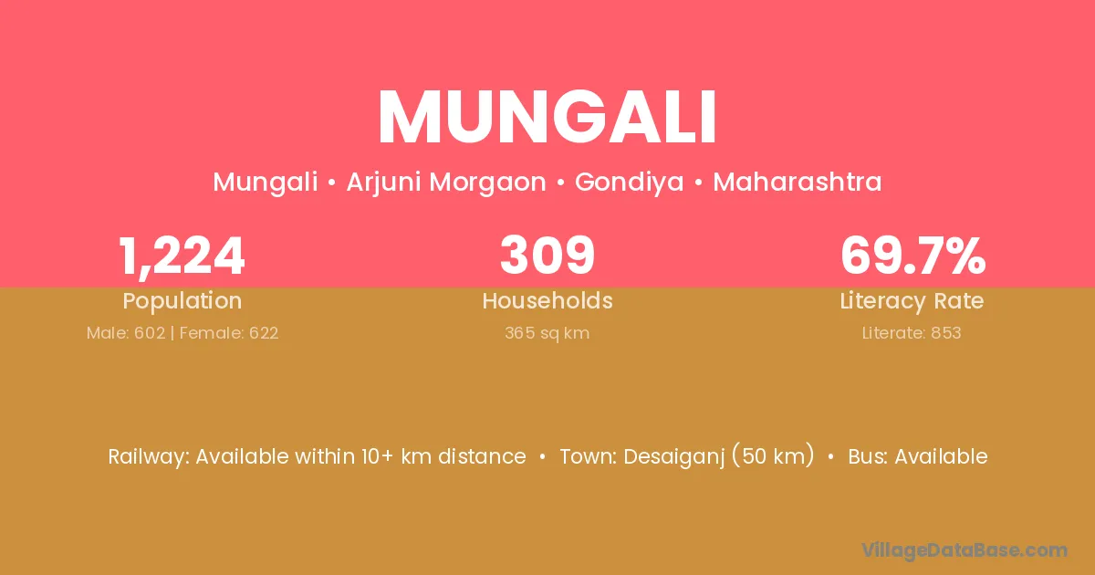 Mungali village has a total population of 1,224 people, of which 602 are males and 622 are females.