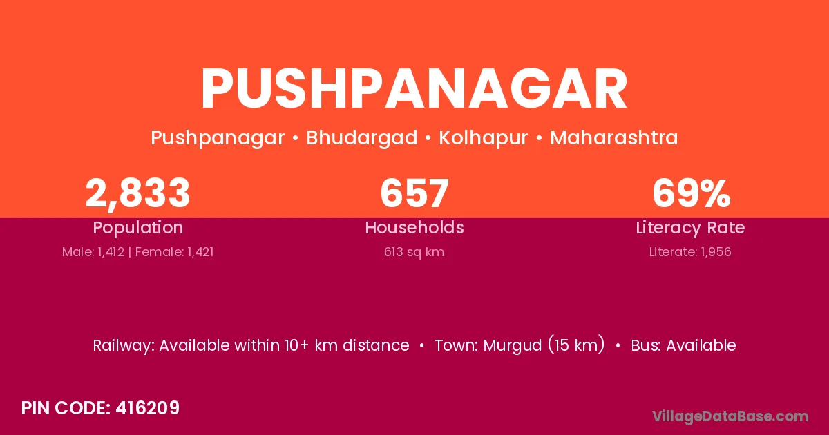 Pushpanagar village has a total population of 224 people, of which 118 are males and 106 are females.