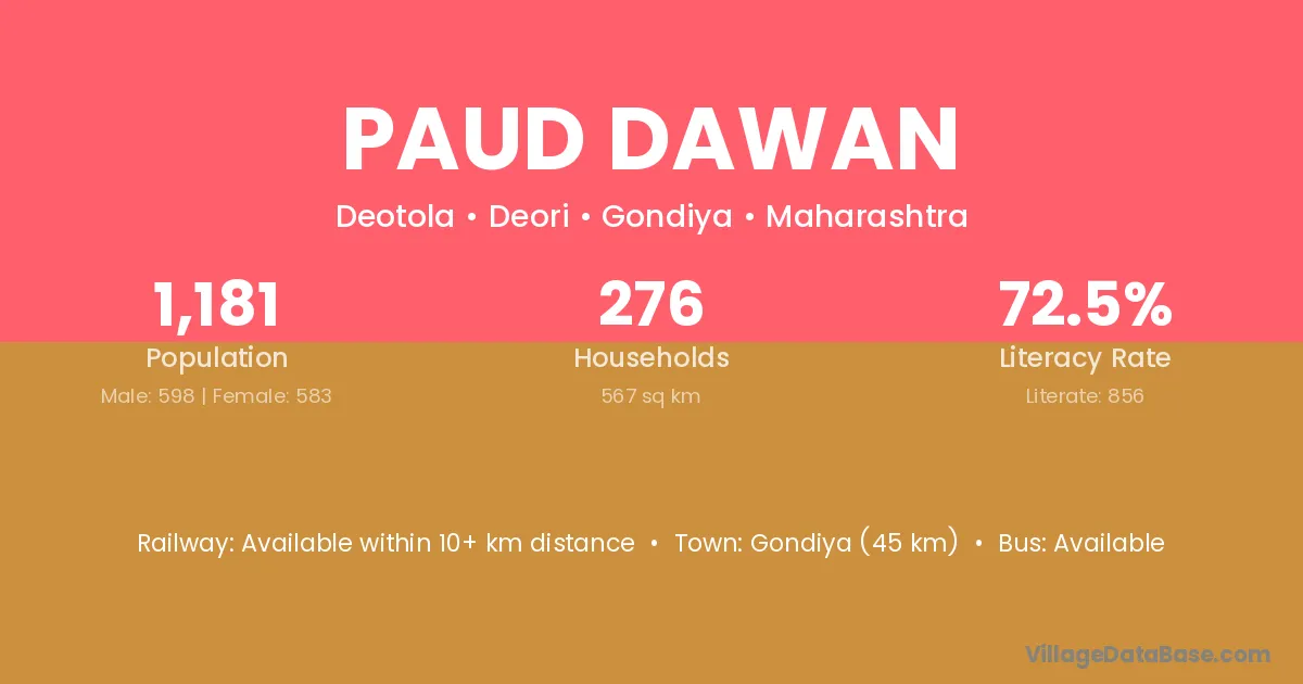 Gondiya (45 km) is the nearest town to Paud Dawan village for major economic activities and is located approximately 45 km away.