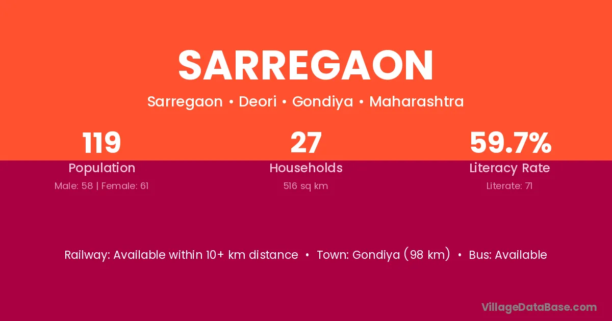 Sarregaon village has a total population of 119 people, of which 58 are males and 61 are females.