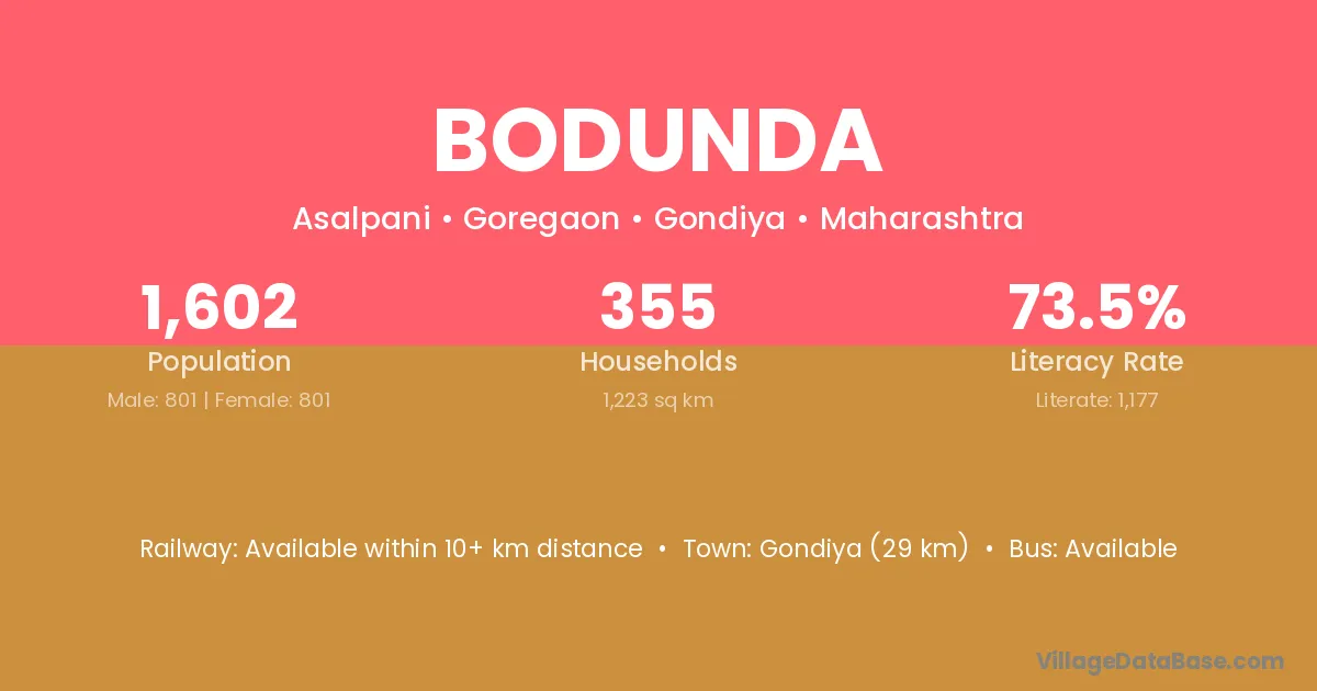 Gondiya (29 km) is the nearest town to Bodunda village for major economic activities and is located approximately 29 km away.