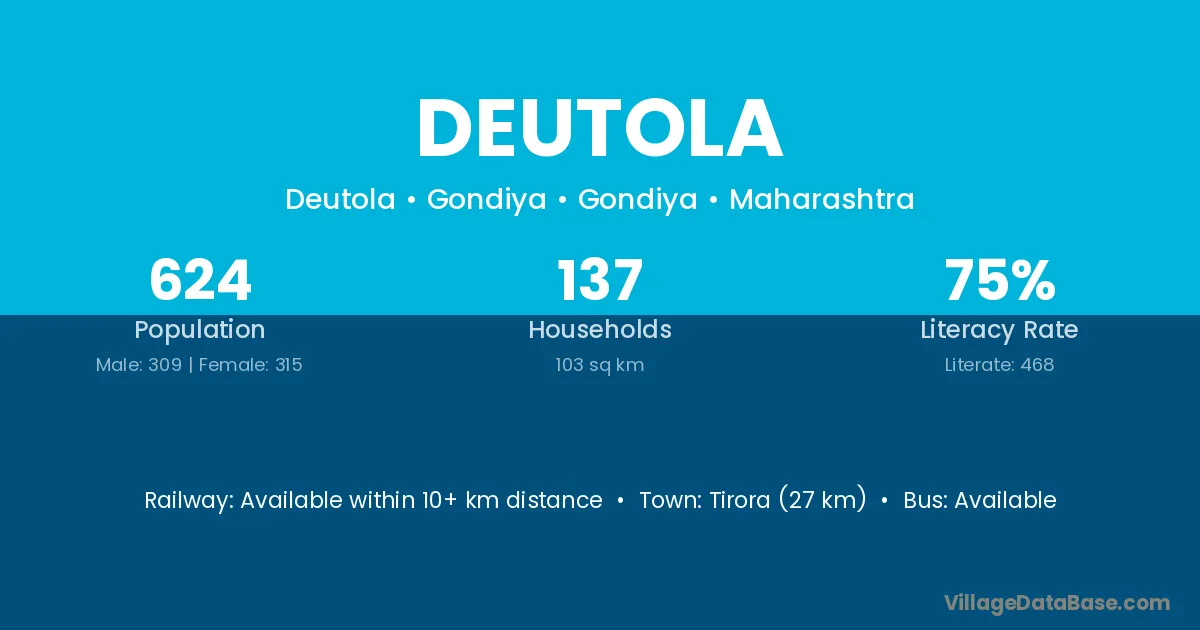 Gondiya (20 km) is the nearest town to Deutola village for major economic activities and is located approximately 20 km away.