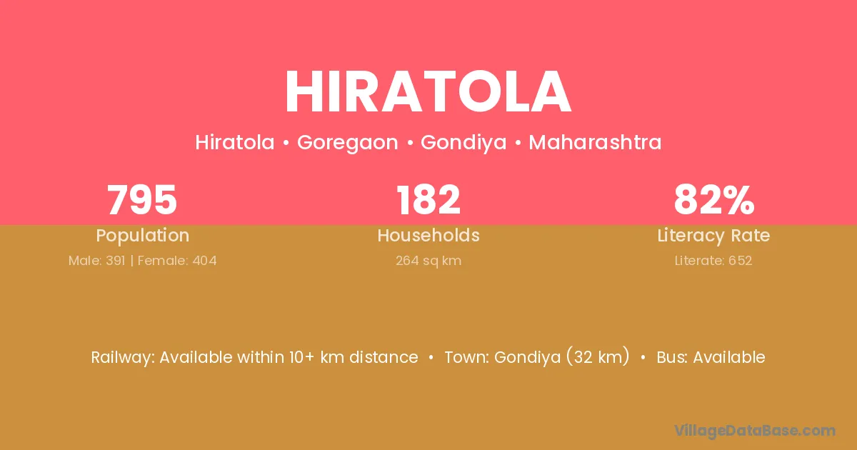 Gondiya (32 km) is the nearest town to Hiratola village for major economic activities and is located approximately 32 km away.