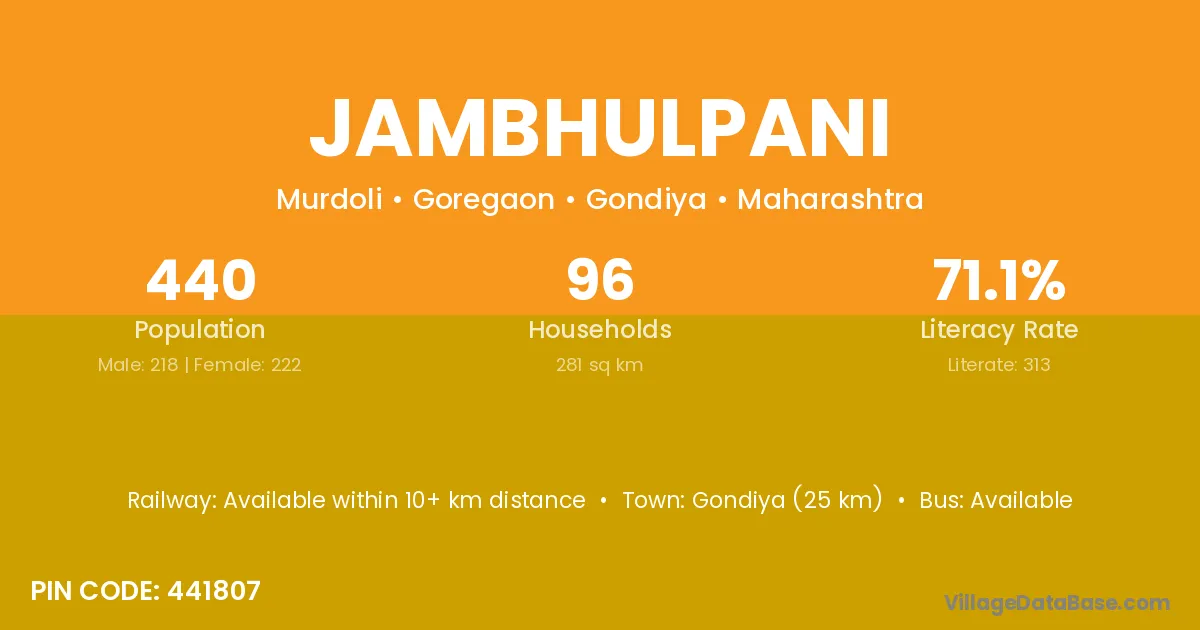 Gondiya (25 km) is the nearest town to Jambhulpani village for major economic activities and is located approximately 25 km away.
