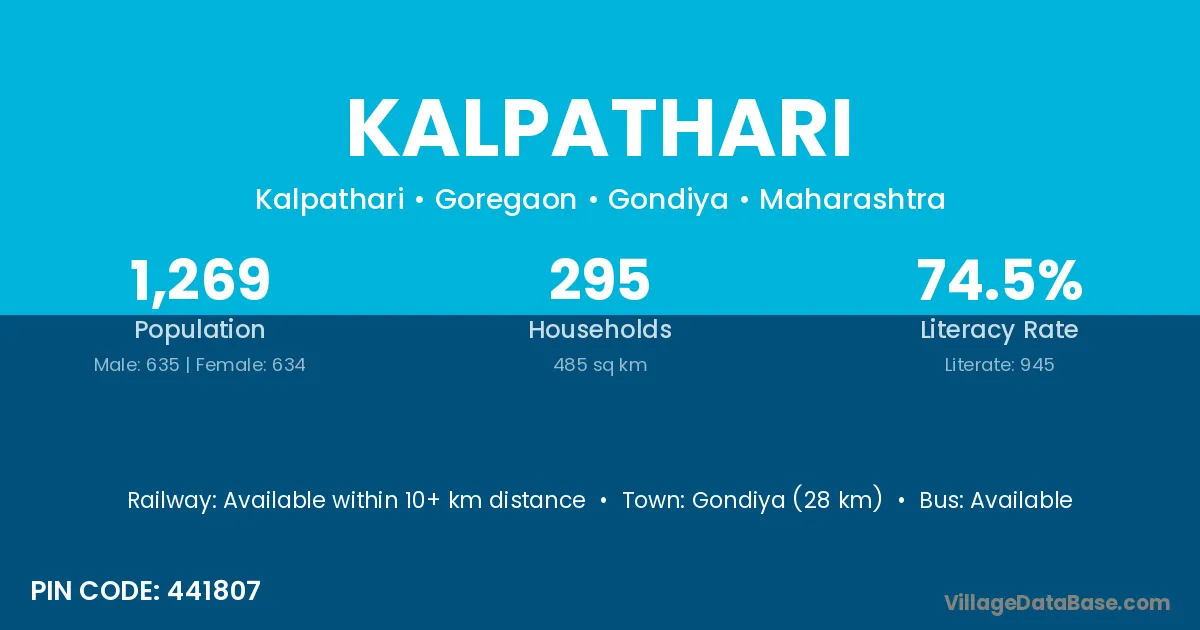 Gondiya (28 km) is the nearest town to Kalpathari village for major economic activities and is located approximately 28 km away.