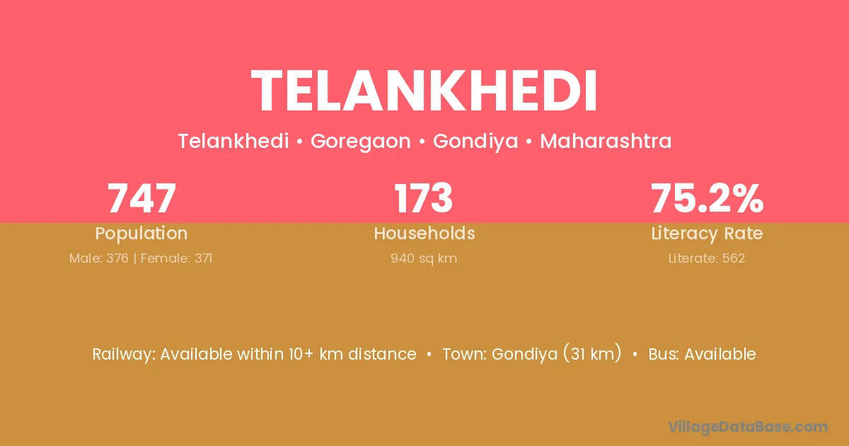 Gondiya (31 km) is the nearest town to Telankhedi village for major economic activities and is located approximately 31 km away.