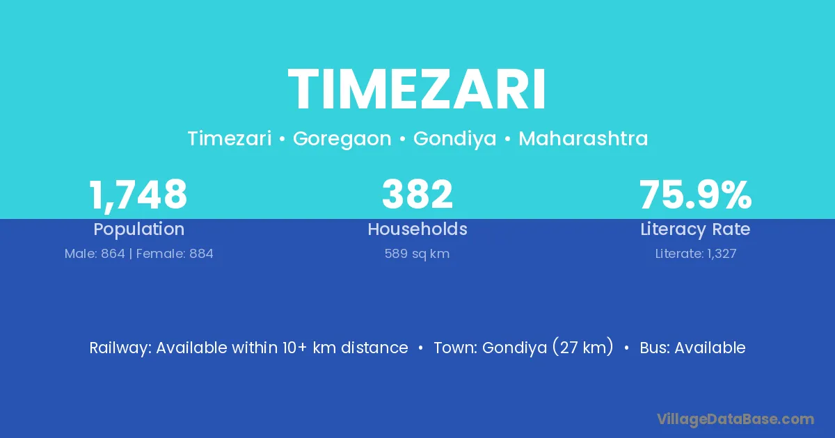 Gondiya (27 km) is the nearest town to Timezari village for major economic activities and is located approximately 27 km away.