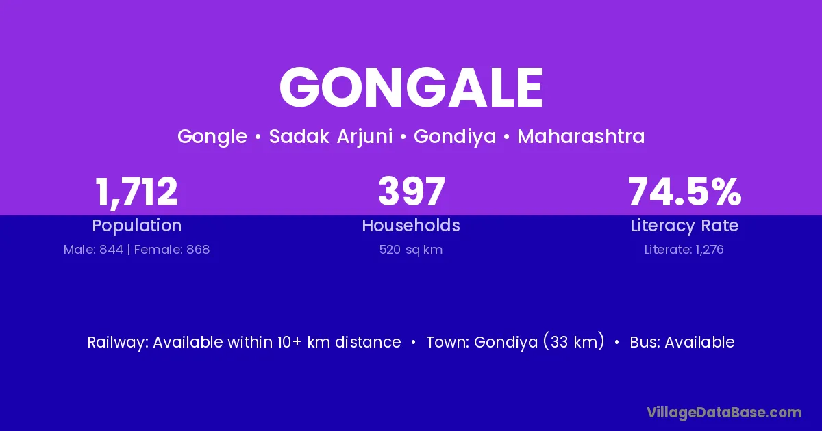 Gondiya (33 km) is the nearest town to Gongale village for major economic activities and is located approximately 33 km away.