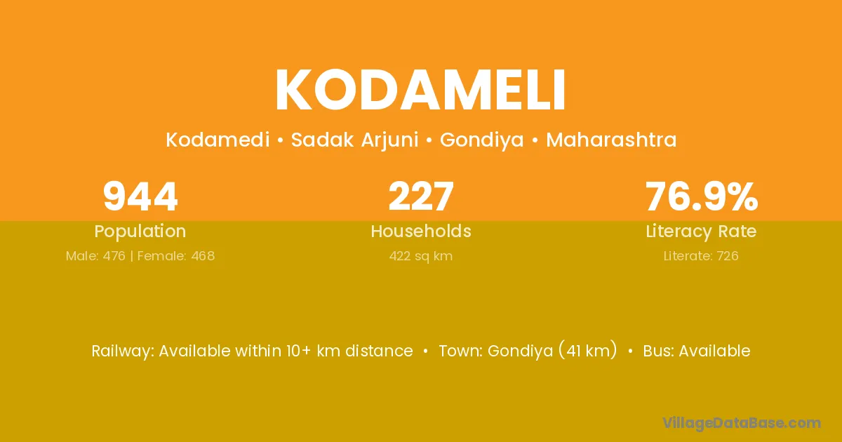 Gondiya (41 km) is the nearest town to Kodameli village for major economic activities and is located approximately 41 km away.