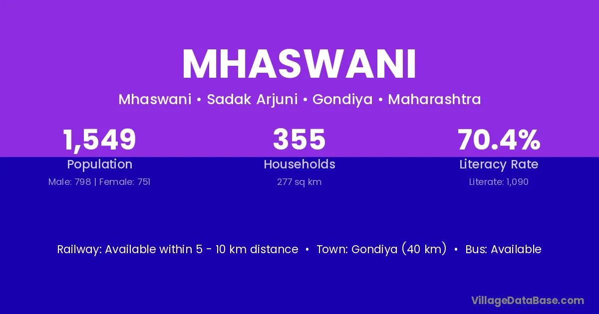 Gondiya (40 km) is the nearest town to Mhaswani village for major economic activities and is located approximately 40 km away.