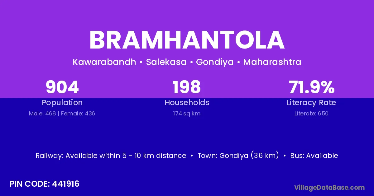 Gondiya (36 km) is the nearest town to Bramhantola village for major economic activities and is located approximately 36 km away.