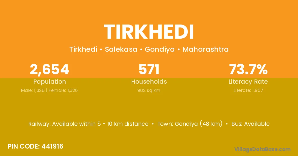 Gondiya (48 km) is the nearest town to Tirkhedi village for major economic activities and is located approximately 48 km away.