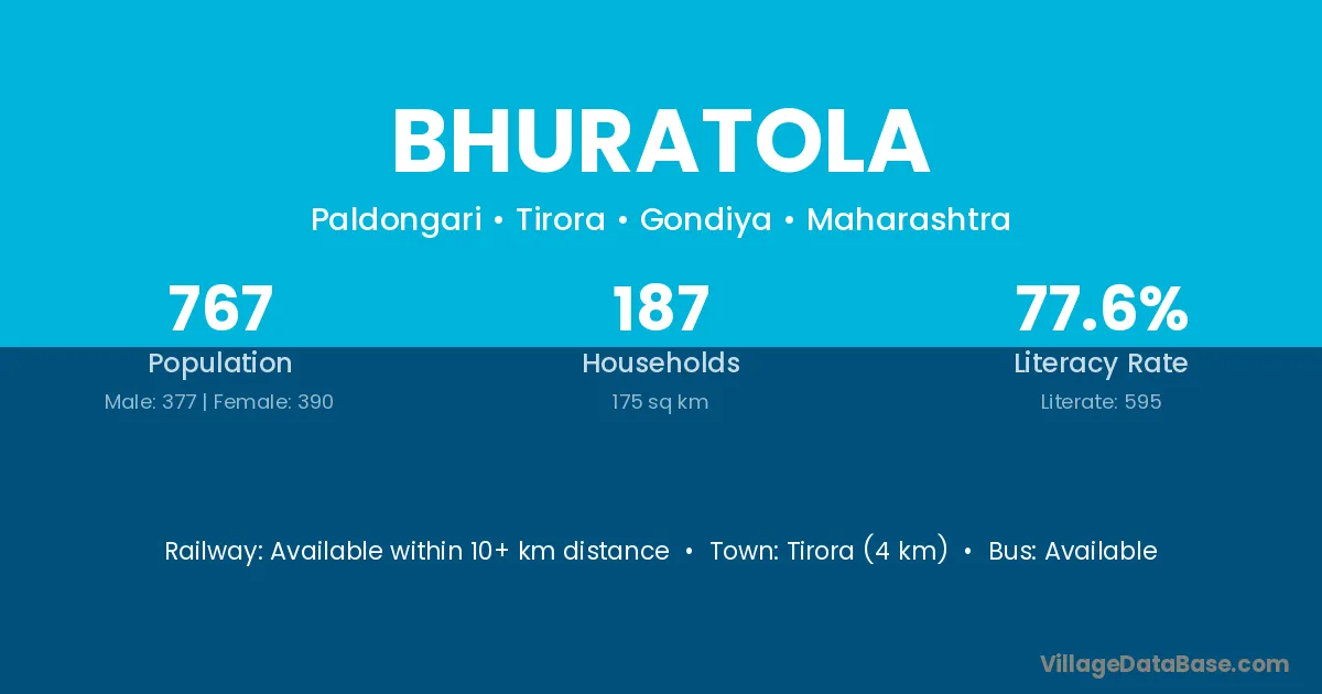 Tirora (4 km) is the nearest town to Bhuratola village for major economic activities and is located approximately 4 km away.