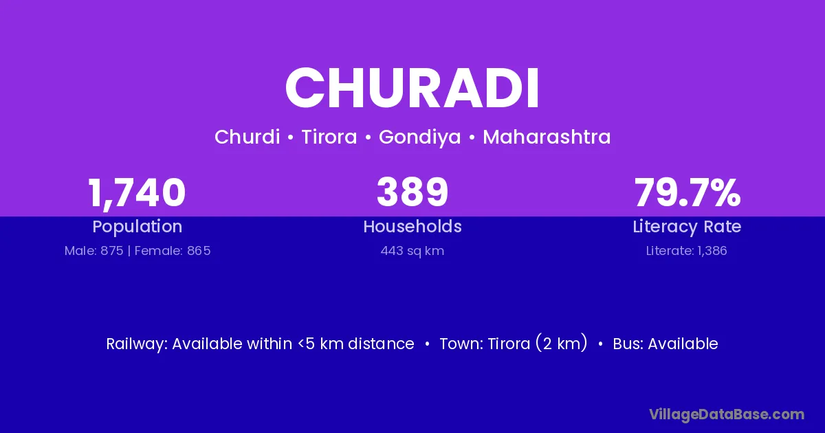 Tirora (2 km) is the nearest town to Churadi village for major economic activities and is located approximately 2 km away.