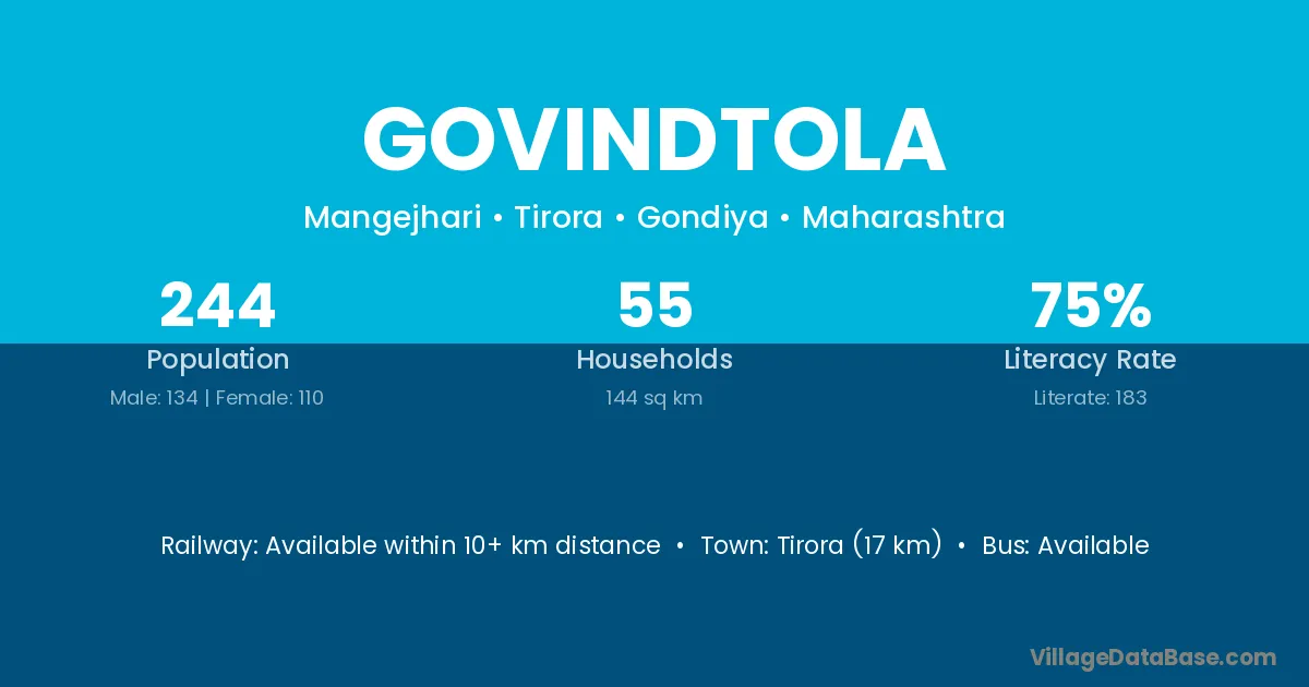 Tirora (17 km) is the nearest town to Govindtola village for major economic activities and is located approximately 17 km away.