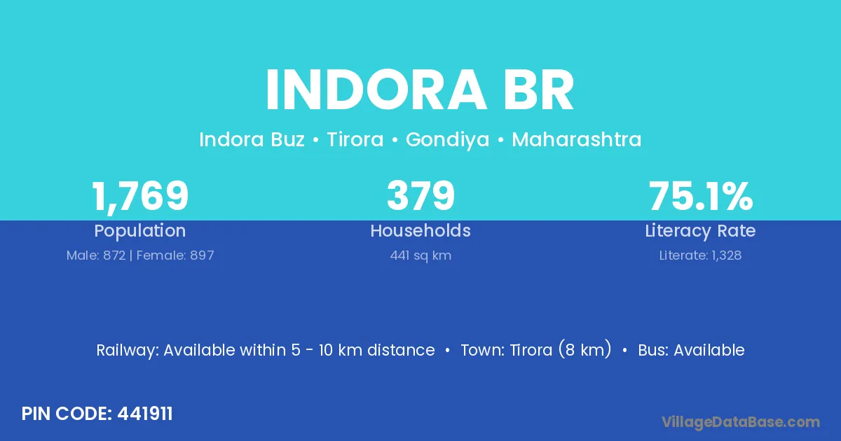 Tirora (8 km) is the nearest town to Indora Br village for major economic activities and is located approximately 8 km away.