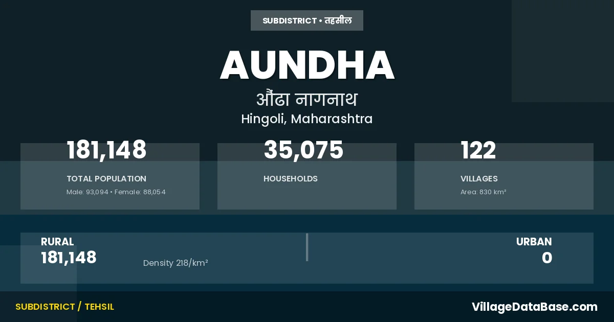 According to the 2011 census The total area of Aundha Tehsil is 830 km², with a population of 181148 people. The population density is 218 inhabitants per square kilometre, and there are approximately 35075 houses in the sub district.