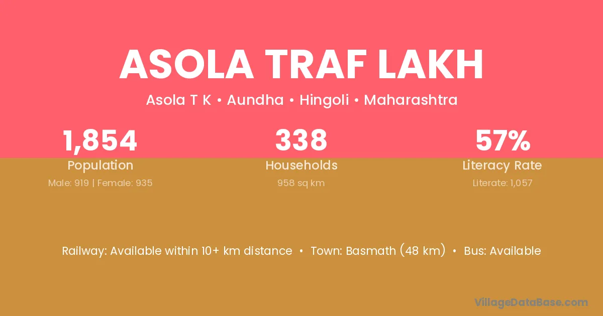 Basmath (48 km) is the nearest town to Asola Traf Lakh village for major economic activities and is located approximately 48 km away.