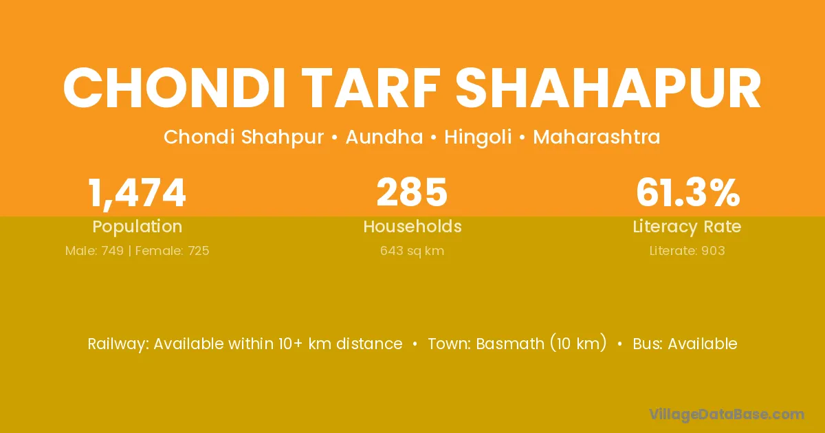 Basmath (10 km) is the nearest town to Chondi Tarf Shahapur village for major economic activities and is located approximately 10 km away.