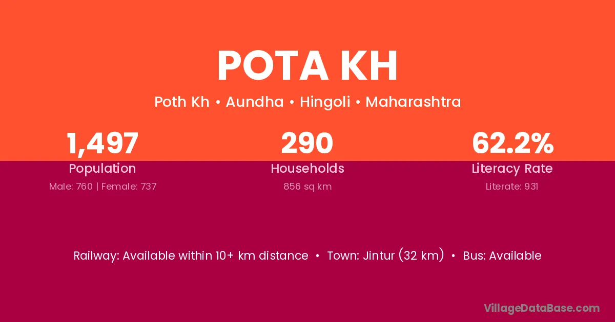 Jintur (32 km) is the nearest town to Pota Kh village for major economic activities and is located approximately 32 km away.
