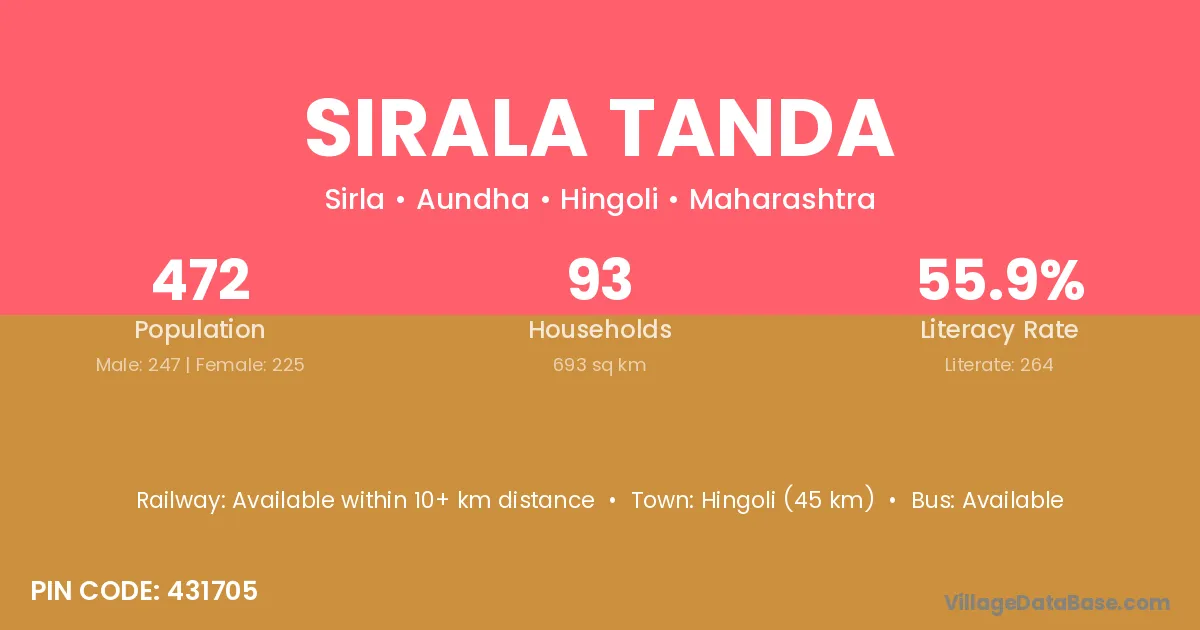 Hingoli (45 km) is the nearest town to Sirala Tanda village for major economic activities and is located approximately 45 km away.