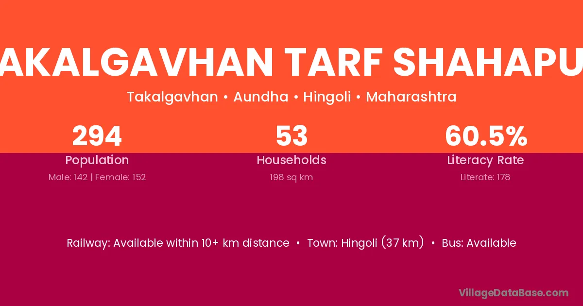 Hingoli (37 km) is the nearest town to Takalgavhan Tarf Shahapur village for major economic activities and is located approximately 37 km away.