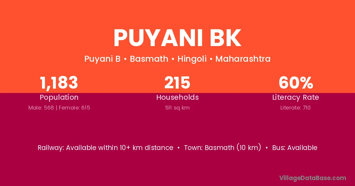 Puyani Bk village has a total population of 1,183 people, of which 568 are males and 615 are females.
