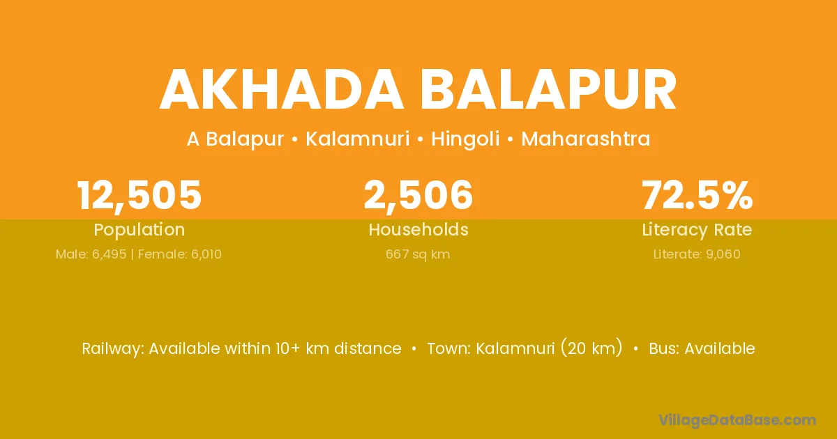Kalamnuri (20 km) is the nearest town to Akhada Balapur village for major economic activities and is located approximately 20 km away.