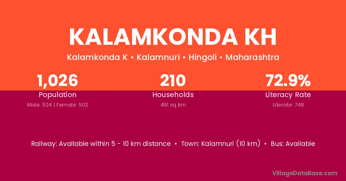 Kalamkonda Kh village has a total population of 1,026 people, of which 524 are males and 502 are females.