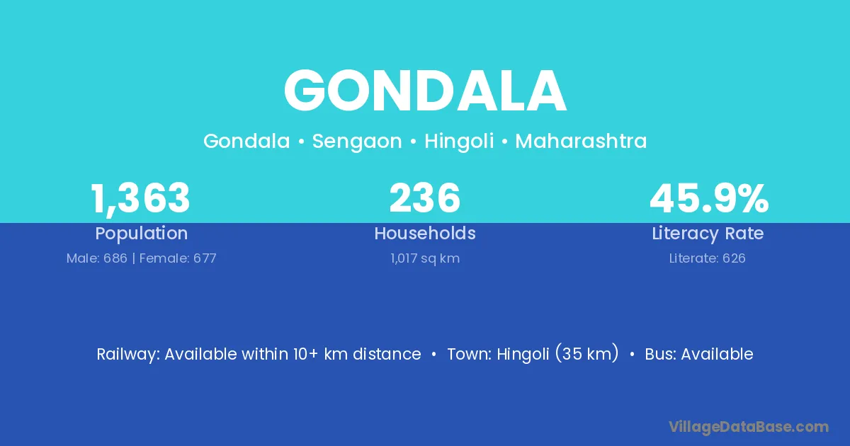Hingoli (35 km) is the nearest town to Gondala village for major economic activities and is located approximately 35 km away.