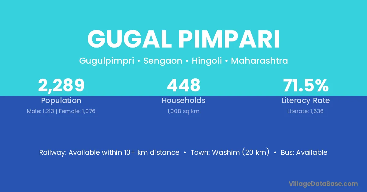 Washim (20 km) is the nearest town to Gugal Pimpari village for major economic activities and is located approximately 20 km away.