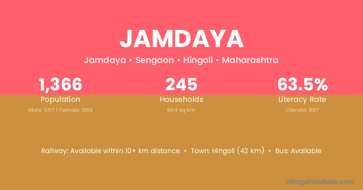 Hingoli (42 km) is the nearest town to Jamdaya village for major economic activities and is located approximately 42 km away.