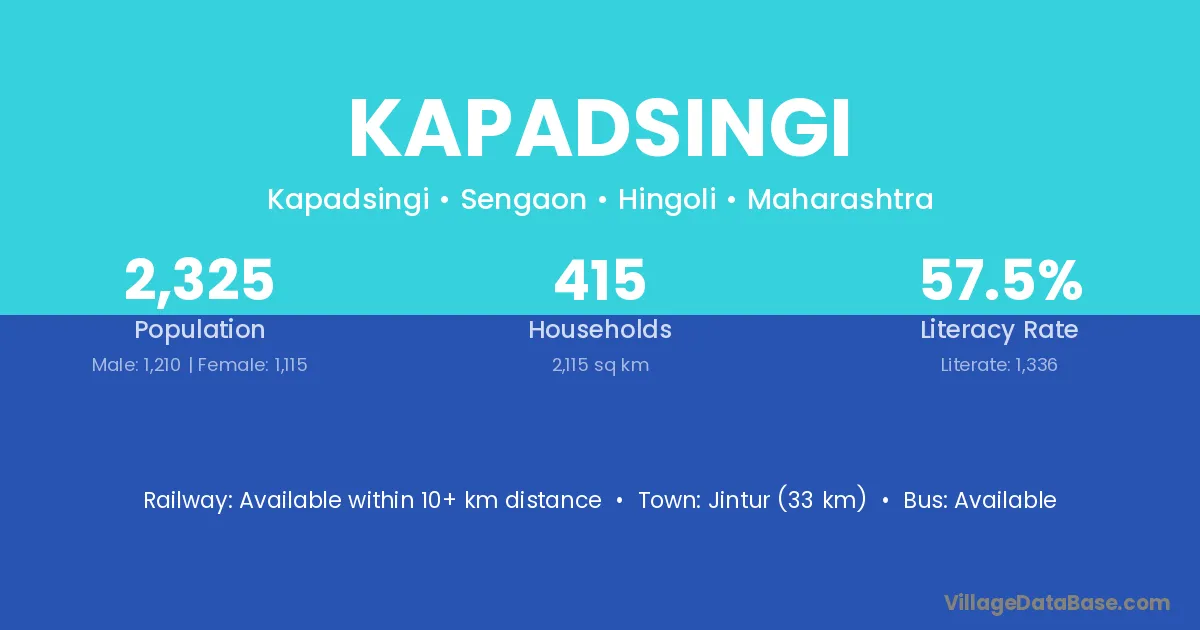 Jintur (33 km) is the nearest town to Kapadsingi village for major economic activities and is located approximately 33 km away.