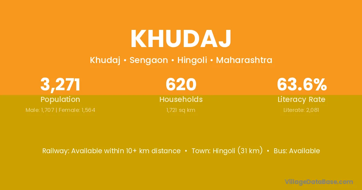 Hingoli (31 km) is the nearest town to Khudaj village for major economic activities and is located approximately 31 km away.