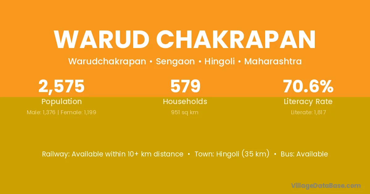 Hingoli (35 km) is the nearest town to Warud Chakrapan village for major economic activities and is located approximately 35 km away.