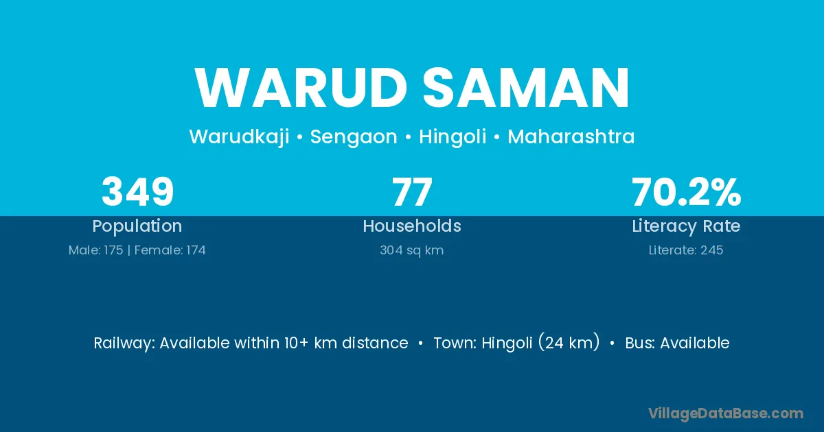 Hingoli (24 km) is the nearest town to Warud Saman village for major economic activities and is located approximately 24 km away.