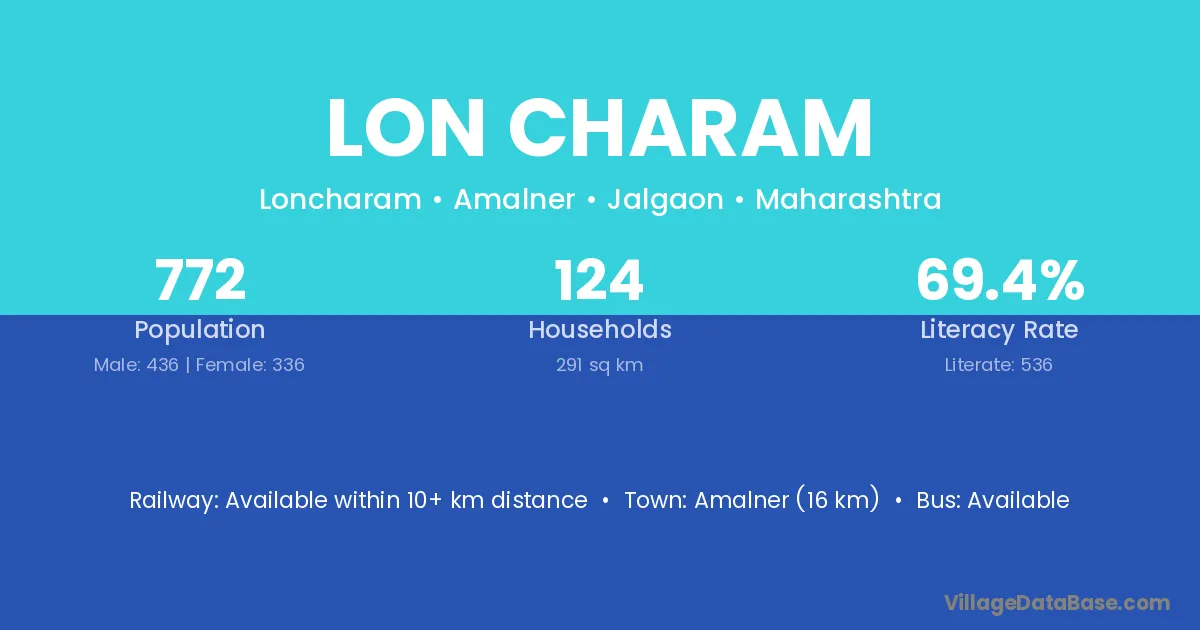 Amalner (16 km) is the nearest town to Lon Charam village for major economic activities and is located approximately 16 km away.