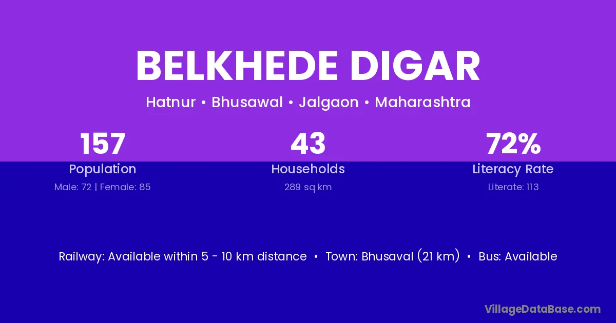 Bhusaval (21 km) is the nearest town to Belkhede Digar village for major economic activities and is located approximately 21 km away.