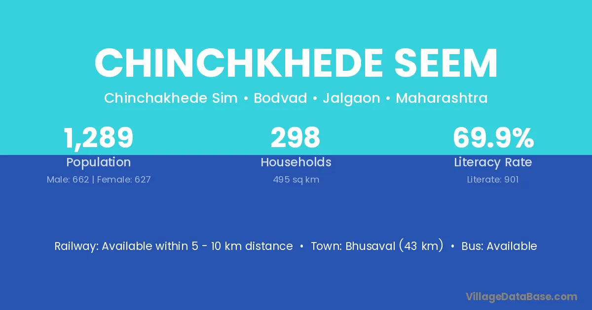 Bhusaval (43 km) is the nearest town to Chinchkhede Seem village for major economic activities and is located approximately 43 km away.