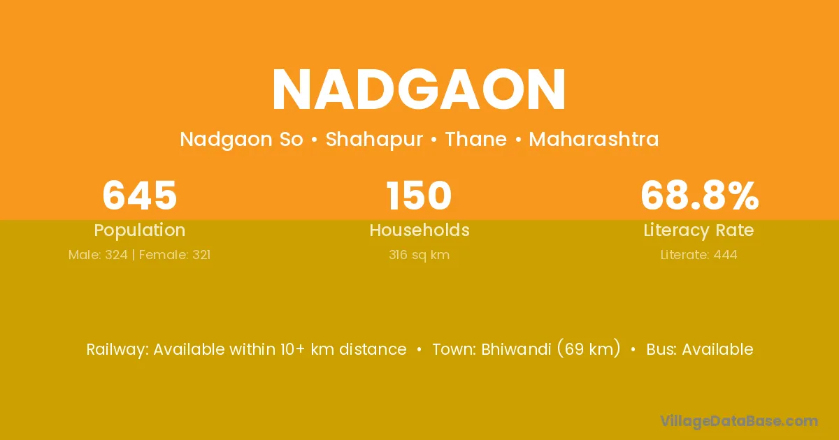 Nadgaon village has a total population of 3,174 people, of which 1,649 are males and 1,525 are females.