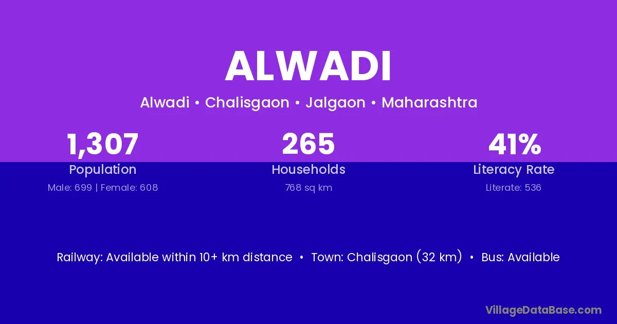 Chalisgaon (32 km) is the nearest town to Alwadi village for major economic activities and is located approximately 32 km away.