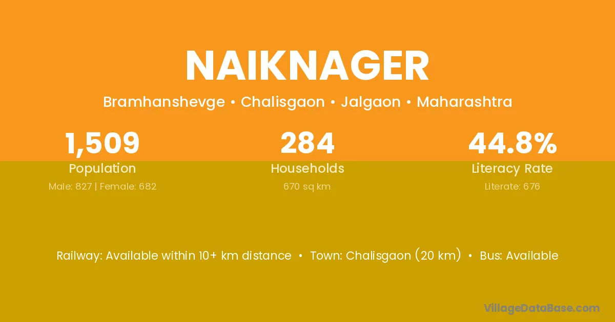 Chalisgaon (20 km) is the nearest town to Naiknager village for major economic activities and is located approximately 20 km away.