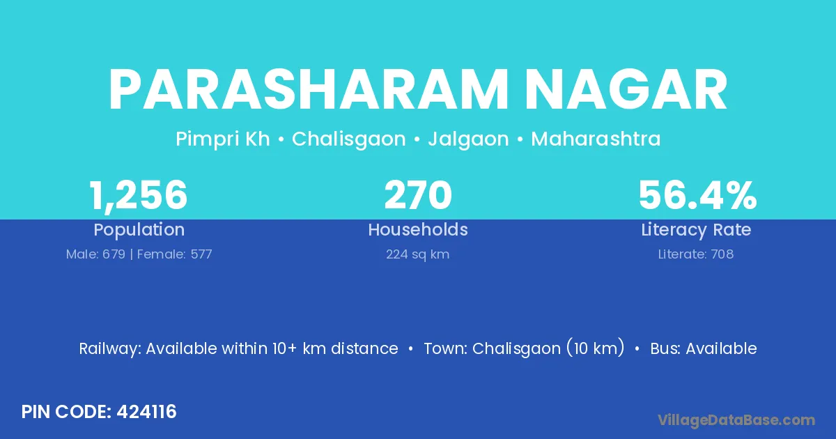 Chalisgaon (10 km) is the nearest town to Parasharam Nagar village for major economic activities and is located approximately 10 km away.
