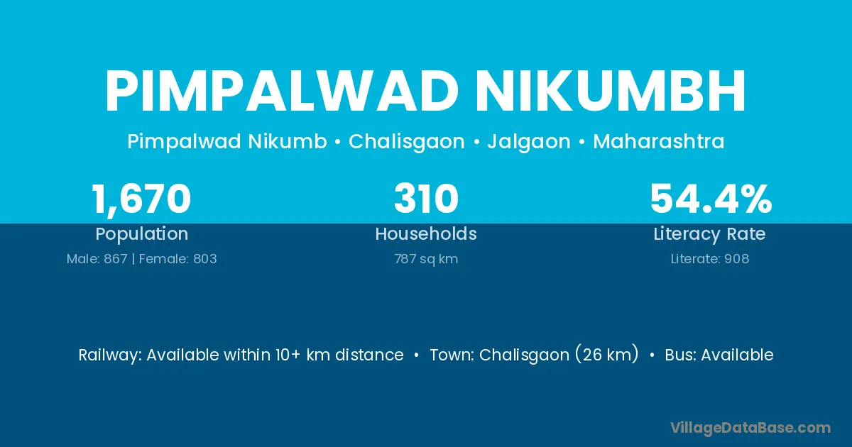 Pimpalwad Nikumbh village has a total population of 1,670 people, of which 867 are males and 803 are females.
