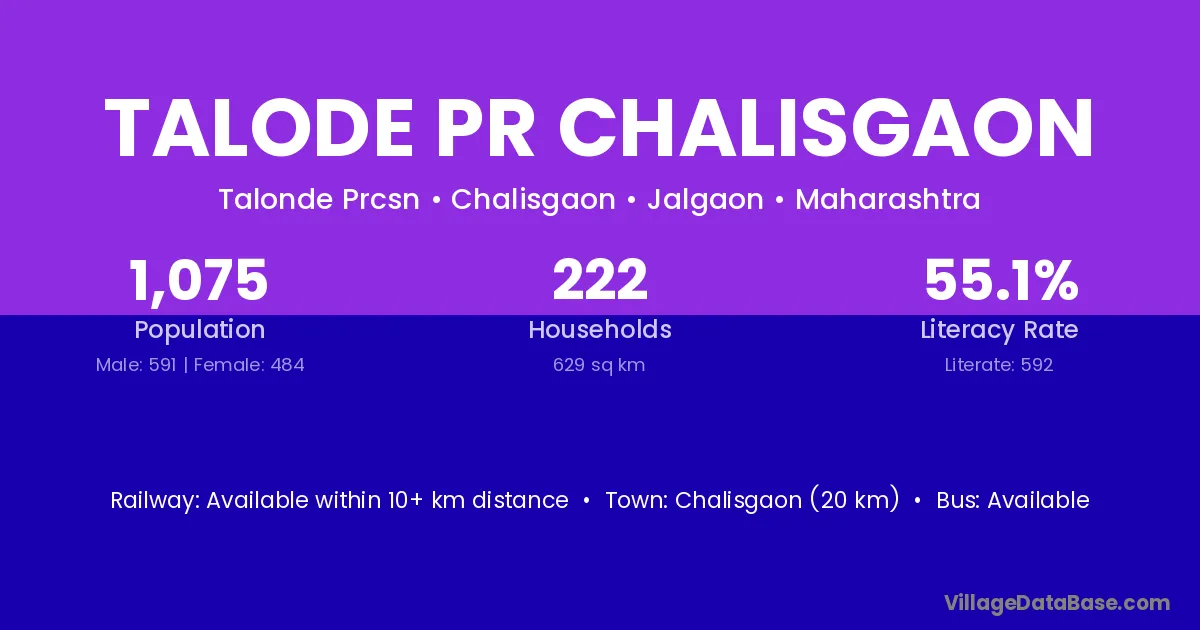 Talode Pr Chalisgaon village has a total population of 1,075 people, of which 591 are males and 484 are females.