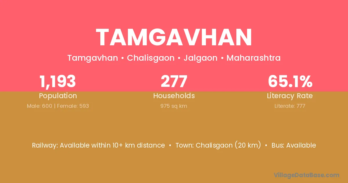 Tamgavhan village has a total population of 1,193 people, of which 600 are males and 593 are females.
