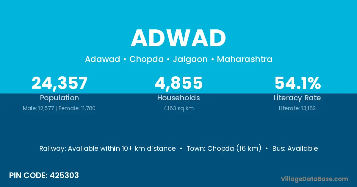 Chopda (16 km) is the nearest town to Adwad village for major economic activities and is located approximately 16 km away.