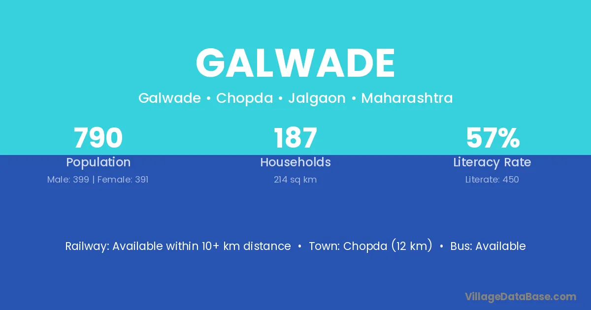 Chopda (12 km) is the nearest town to Galwade village for major economic activities and is located approximately 12 km away.