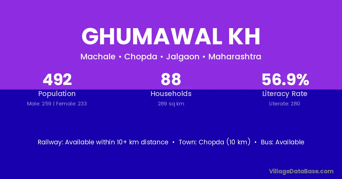 Chopda (10 km) is the nearest town to Ghumawal Kh village for major economic activities and is located approximately 10 km away.