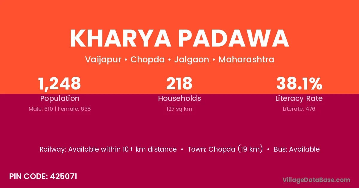 Chopda (19 km) is the nearest town to Kharya Padawa village for major economic activities and is located approximately 19 km away.